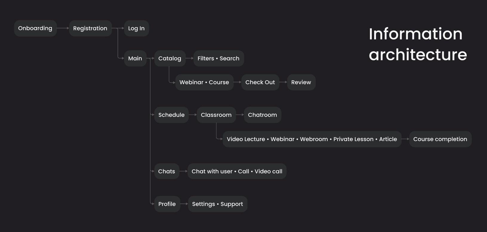 I paid special attention to the following sections: onboarding and personalization, a catalog of educational materials, a study room, chats and groups.